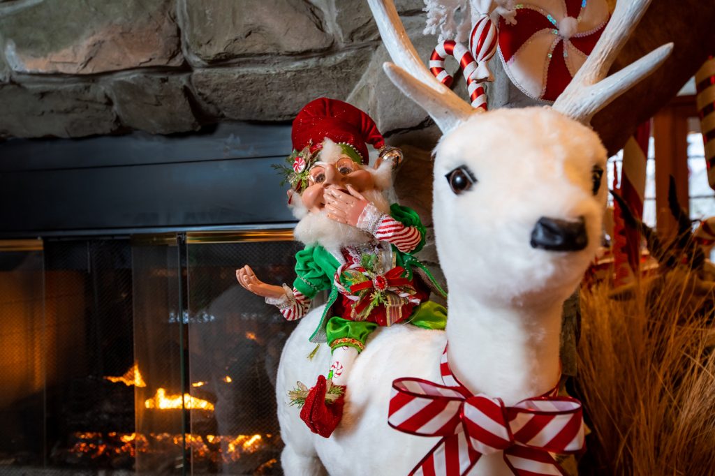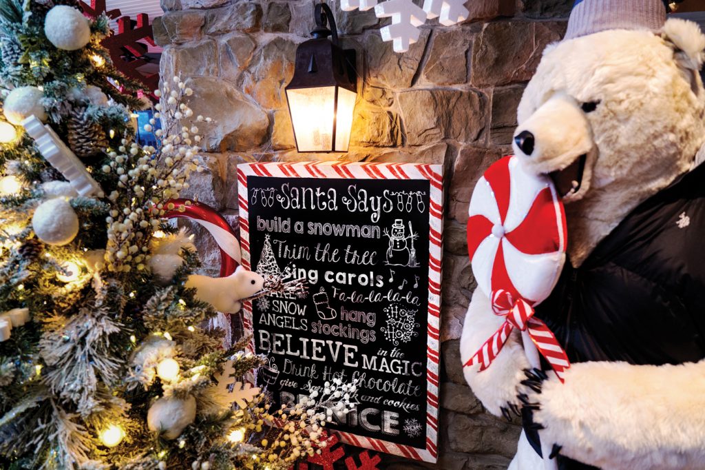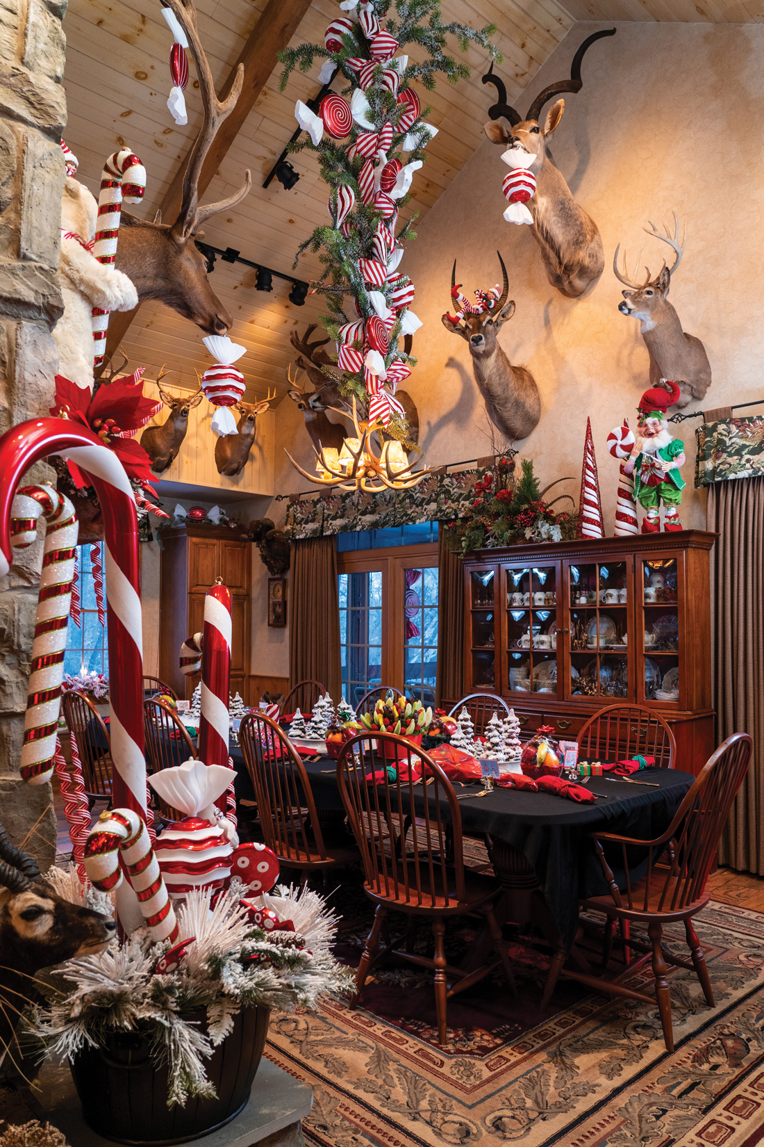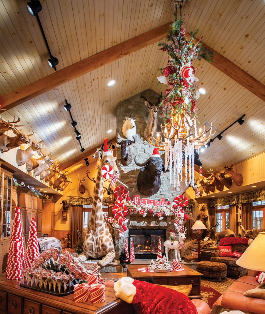 When the lodge was finished in time for Christmas 2001, it became holiday central for family and friends. It ultimately evolved from being Larry’s man cave to a place where he and Sally can entertain family and friends for holiday (all of them) gatherings and other celebrations. “It’s become a party house,” explains Tim, who now decorates the lodge’s exterior throughout the year to reflect the changing seasons. As for the lodge’s interior Christmas/winter décor, which Tim oversees, it gets installed in early November and stays in place until some time in February.