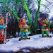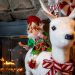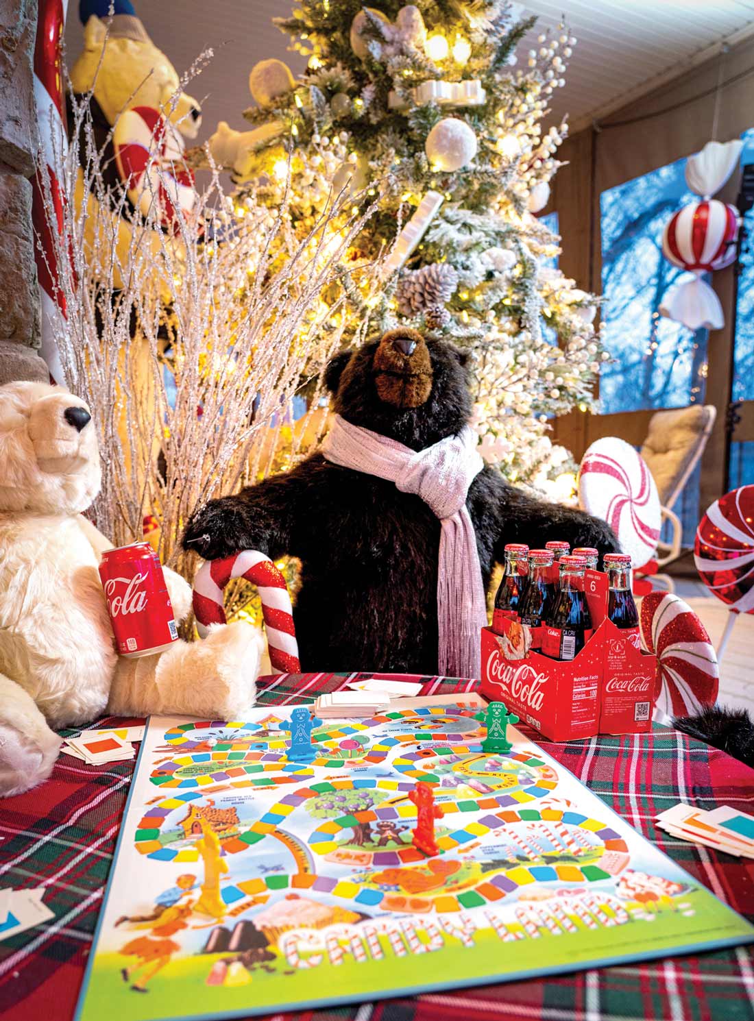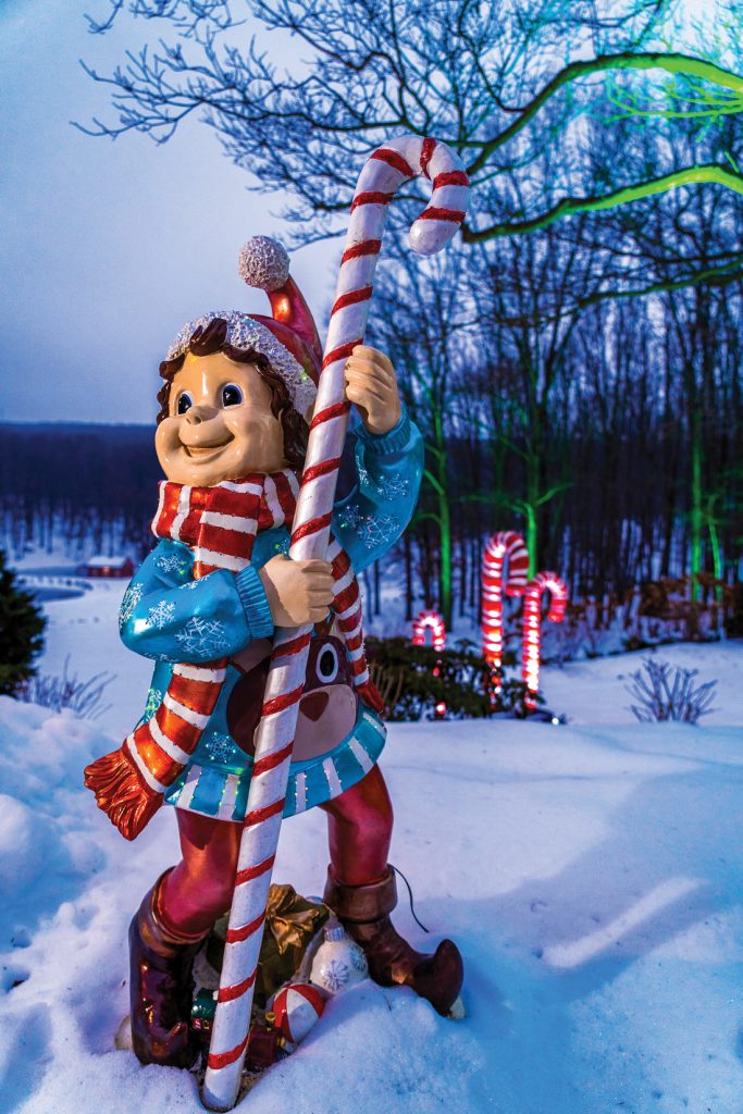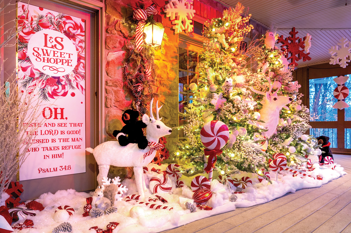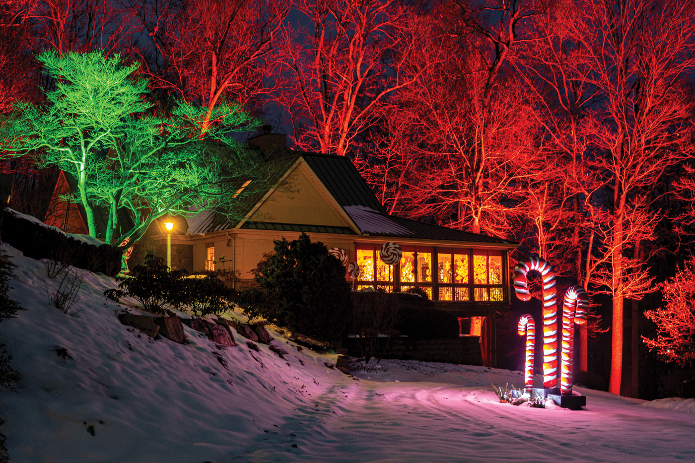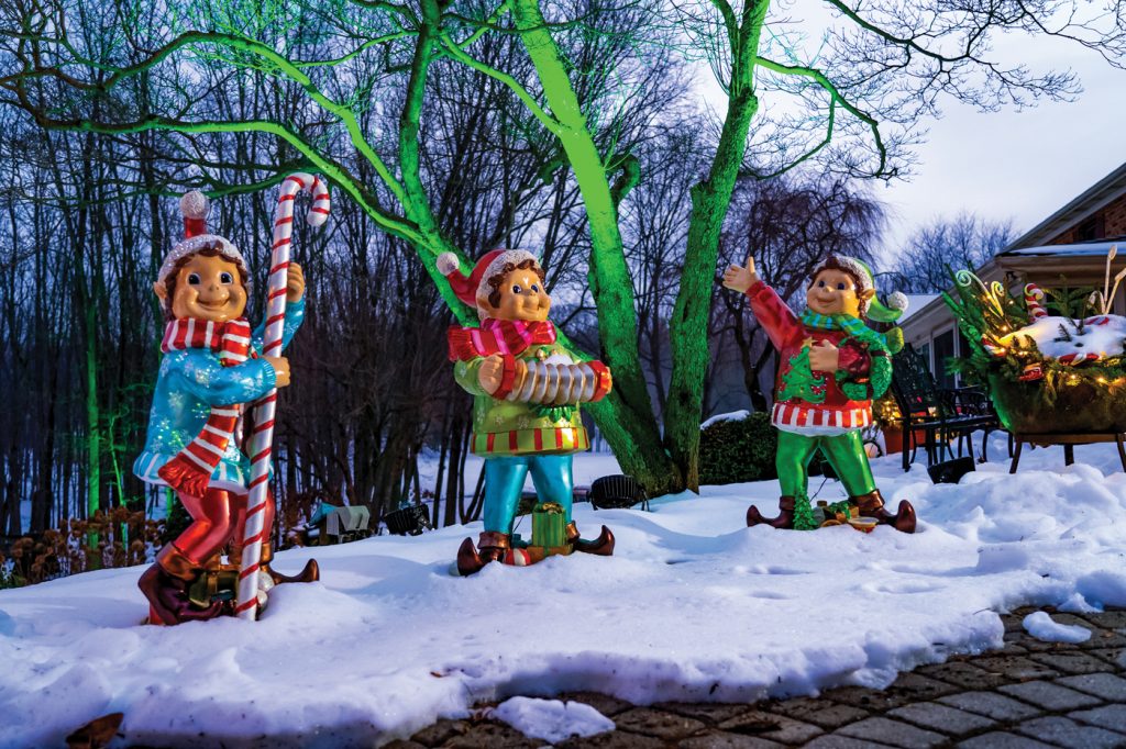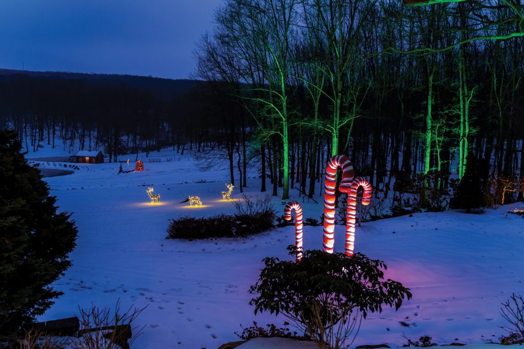 The theme encompassed the porch as well as outdoor areas, where trails of red and white lights led the way from the house to the hunting lodge. Colorful lollipops – created by artist Michael Hurrell of Millersville – were also situated along the pathways leading to the lodge. The final touch was dramatic uplighting – in hues of red and green – that washed over the stands of trees that surround the property.