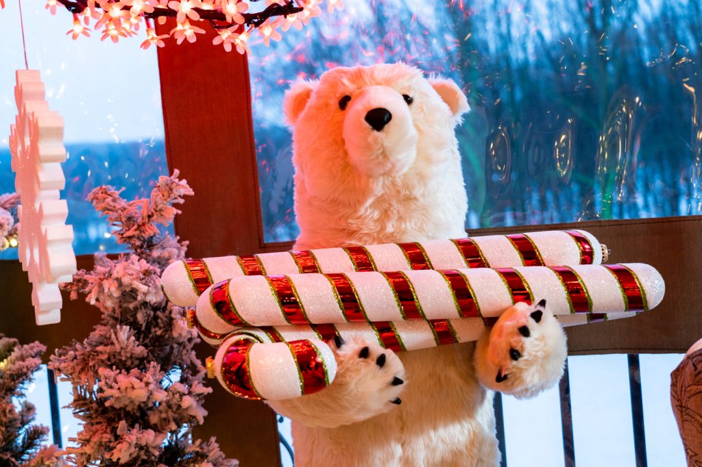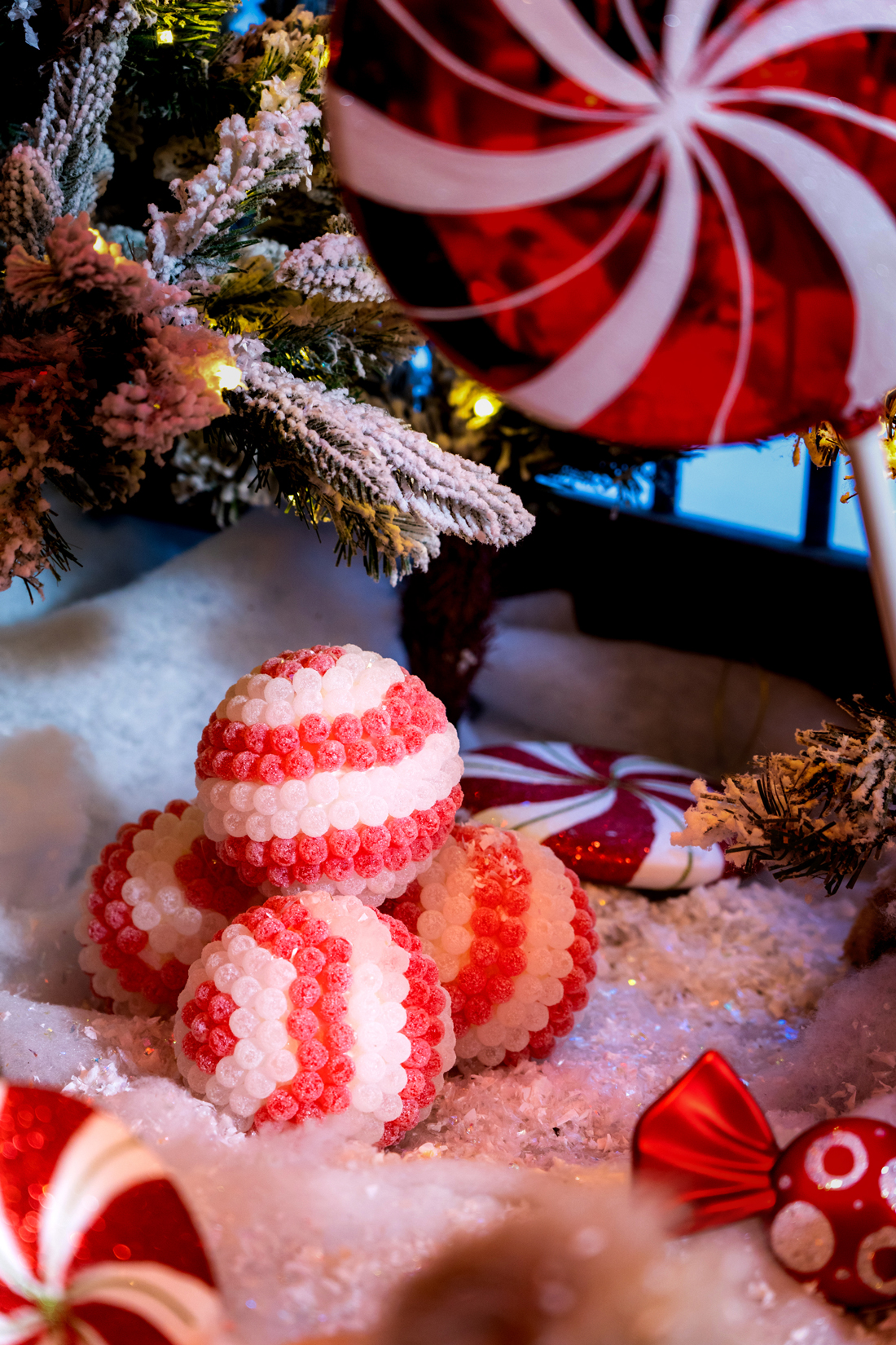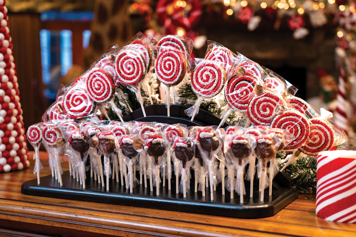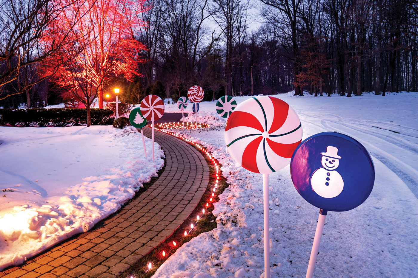 Artist Michael Hurrell created the lollipops that led the way to the lodge. The walkways were lined in red-and-white lights.