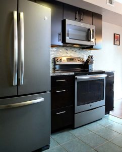 Think more along the lines of gray tones such as slate and graphite as opposed to black. This alternative to stainless defies fingerprints, smudges and dirt. Magnets will adhere to it. The neutral color pairs with all colors and room styles. In Sheri’s opinion, “People are ready for an alternative to stainless.”