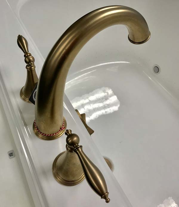 As seen at Hajoca: Coppery hues are gaining favor in the bath and kitchen. Copper is also part of the metallic trend in fabrics (pillow from Floral Designs of Mount Joy).