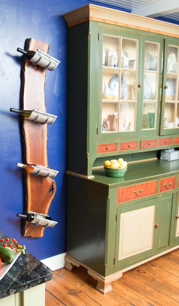 Pete and Carol Heth created the wine rack using finds from construction projects. The reproduction hutch honors age-old furniture-building techniques.