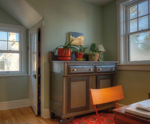 Cosmetically speaking, the house had its share of challenges. The floors were thick with layers of carpet, linoleum and glue. All the windows had been painted shut. Every wall in the house was wallpapered. “Oh, and nothing was straight,” Matthew says of the walls and ceilings. Fortunately, it was in relatively good shape. “I had a retired home-engineering friend and my neighbor, Chris Lainhoff, of Museum Quality Building Restoration, look it over,” Matthew reports.