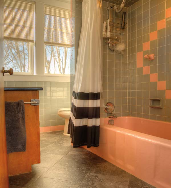 The house dates to 1785. “It had really mutated over the years,” Matthew says, referring to the many remodeling projects that had been carried out. The earliest involved an actual move: The house had been rolled from the adjacent lot and relocated next door (where it gained a basement). A dormer had been added. German siding, which covered the original log construction, was overlaid by aluminum siding at some point. Pink and gray tile indicated the bathroom had been updated in the 60s.