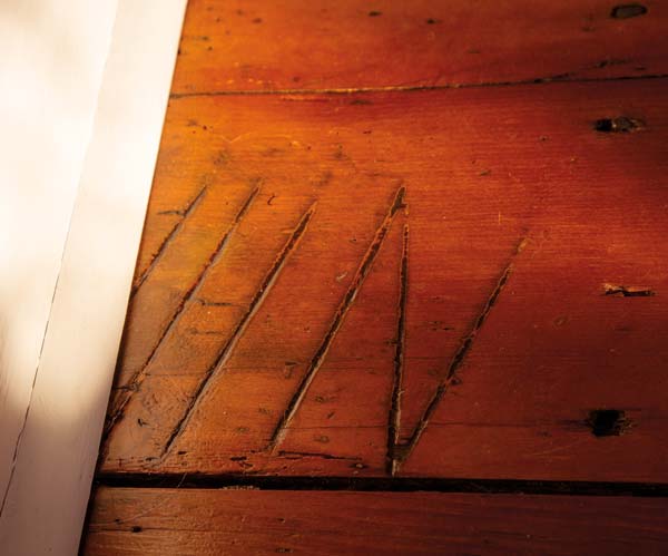 Another treasure was unveiled once the floors were scraped of the layers of carpet, linoleum and glue. White pine covered the floors in the living area. “They were original,” Matthew says, pointing out the Roman numeral tracking marks he found on several of them and explaining the random sizes related to their price tag. “You paid by the cut,” he notes. While the floor in the kitchen was not original, Matthew surmised the yellow pine boards had served as a subfloor at one time and worked to revive them. He managed to save both floors by hand scraping them and using a 5-inch orbital sander to refinish them. Traditional shellac added just the right sheen.