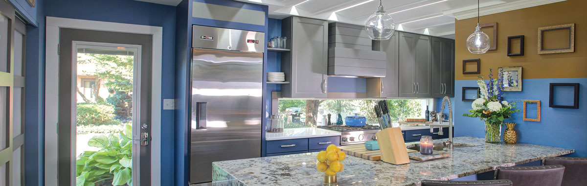 The color scheme would be based on Joe’s favorite color – blue. Flat-panel upper cabinets – painted gray – would add to the modern spin.