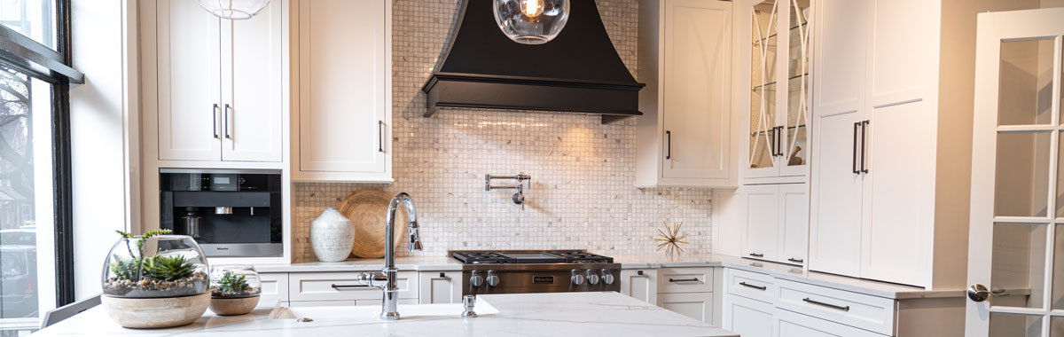 Backsplashes that travel to the ceiling are also in vogue. Quartz has become the counter covering of choice, “especially if it resembles marble,” he adds.