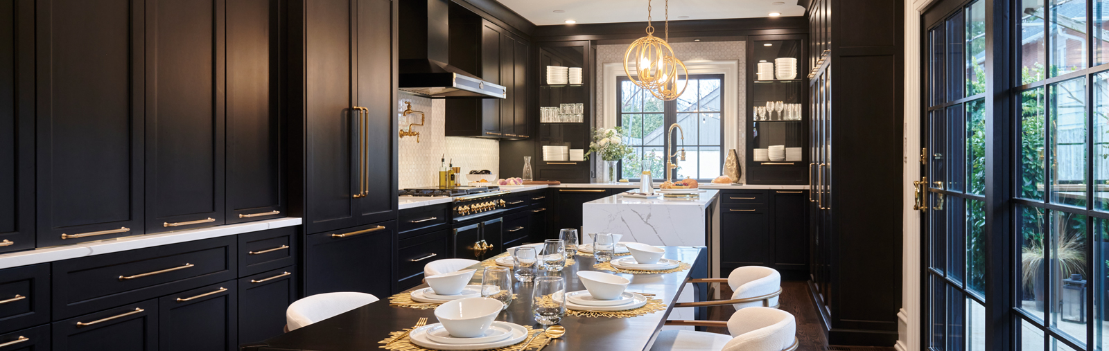 Karen was planning to go with white cabinetry in the kitchen but trusted Olga’s opinion that dark cabinetry would better suit the Old World-meets-glam design theme. Instead, the white element was achieved through the quartz that covers the counters and backsplash, while the gold is reflected in the hardware, lighting and plumbing fixtures. The table is a custom design that can expand to accommodate dozens of guests.