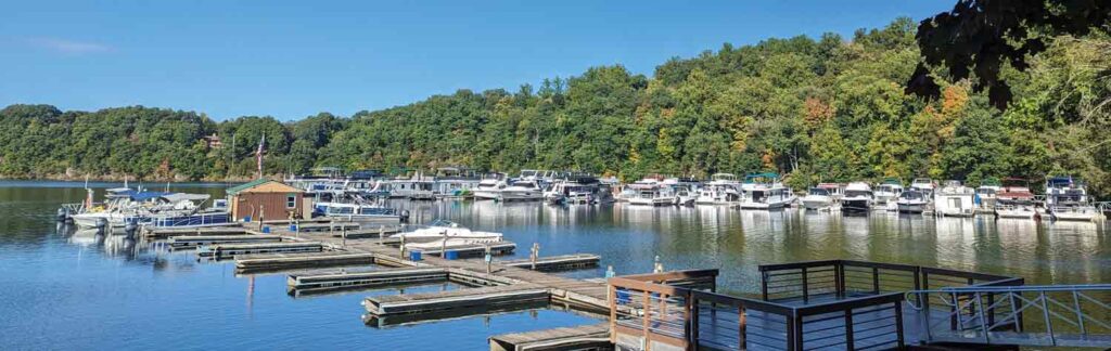 The best overhead view of the dam is from Ridenour Overlook, which is only a short drive from the dam itself. A series of hiking trails with views lead visitors through the wilderness around the lake. Waterfront nuptials take place at Wedding Pointe at the Lake Raystown Resort. More camping and outdoor activities are located further up the lake at Seven Points Recreation Area.