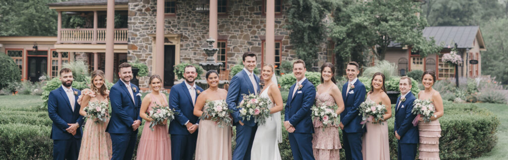 “We knew we wanted an outdoor wedding and for everything to feel fresh and organic,” Emily recalls. “Once we stepped foot on the grounds of Moonstone Manor, we knew it was the perfect spot for the wedding,” she says of spying beautiful flowers growing throughout the immaculately landscaped, tree-shrouded, creekside property that dates to 1742, when Samuel Smith, a miller and trader, became its first owner after securing a deed from the family of William Penn. Since then, the property has served several purposes and had undergone extensive renovations prior to it becoming a full-scale events venue.