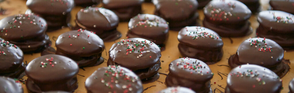 Mini-Whoopies dipped in chocolate were baked by the Fisher family. The second stop took us to the Esh home, where sugar cookies and ornament treats were on the menu. The third stop – the home of a different Esh family – featured pecan cups, Santa confections and hot chocolate. Recipe cards for each cookie recipe (and others) were provided to visitors.