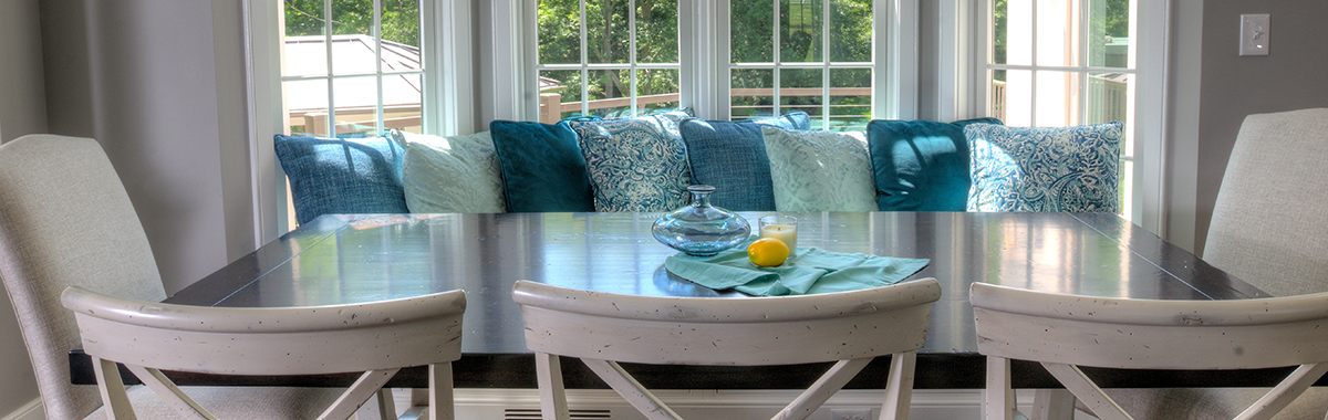 Together, they had to plan a stepped window in the kitchen that would allow room for the cabinetry to meet the wall but maintain the view. Lighting is always a critical feature of interior design projects and here, directional mono-point lights were chosen over recessed lighting in the angled ceiling of the breakfast area. “That way, light could be pinpointed to specific areas as needed,” she explains.