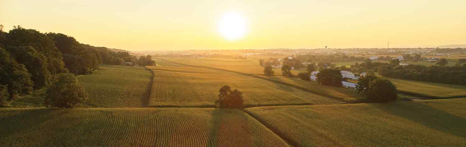 Looking west, the drone shot takes in the treeline of the Welsh Mountains, acres of fertile farm fields and the town of New Holland.