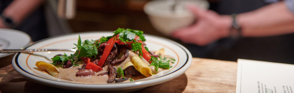 For round four, Andy provides a sampling of his Laughing Lindy cheese. I met Andy’s father years ago when I penned a story on goats for Lancaster County Magazine (September 2013), and I have been a fan of Linden Dale Farms cheeses (found at Central Market) ever since. Laughing Lindy is served on sourdough baked by attendee Janice Longer (who has been practicing law in Lancaster County for over 20 years) and is paired with Tynt Meadow by Mount Saint Bernard Abbey, where “beer should be liquid bread, not colored water.” And so go the pairings as the evening glides along, until the last of the cheeses – Rogue River Blue from Oregon – is offered with a vintage 2013 Gravitation from New Hampshire’s Smuttynose Brewing. After nine decadent beer samples and cheese tastings, incoming tables and chairs temporarily disperse the conversing crowd who eventually find seats for the main course.