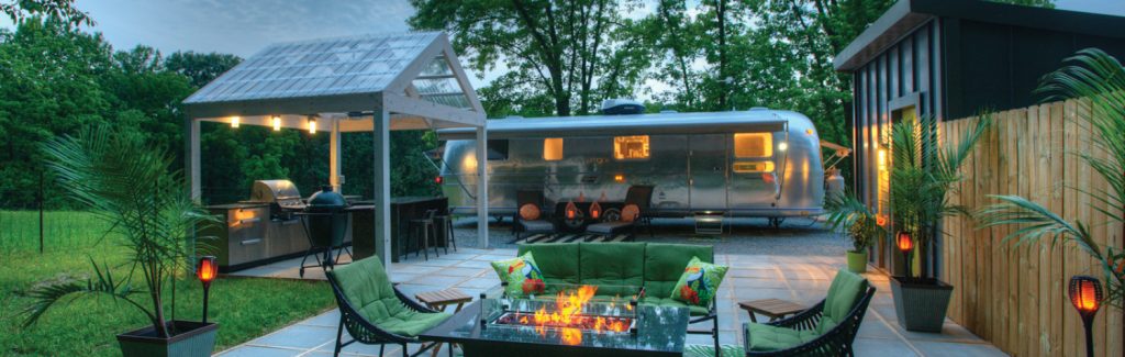 After taking a small break, the Heths began contemplating their next project. “We always wanted to do something in the woods,” Carol says. “I kept seeing all the stories about glamping and I thought, ‘That’s it! We’ll go in a glamping direction!’” The couple then began searching for an Airstream trailer in need of rehabbing. “We found one out near Pittsburgh through Marketplace and bought it,” she says. “It ended up being in worse shape than we originally thought, so Pete decided to take it down to the frame and start over.” It took him the better part of a year to restore the classic Airstream. “It was a learning experience,” he says. “Restoring it involved a different kind of construction.”