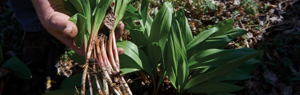 Jim uses a pick to harvest, not forage, ramps for use in menu items and products sold at the John Wright Restaurant.