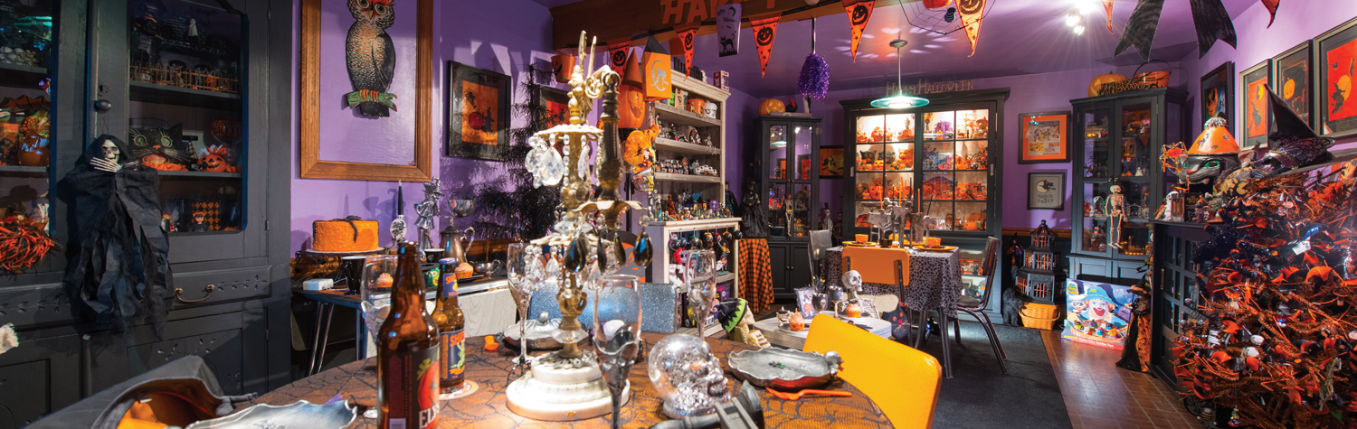 Each September, the Brubakers prepare for Halloween by devoting three weeks to inspecting and cleaning the items in the Halloween room, rearranging the displays and squeezing in new finds. The room is literally bursting at its seams. “There’s no more room for another table or cabinet,” Denise says.