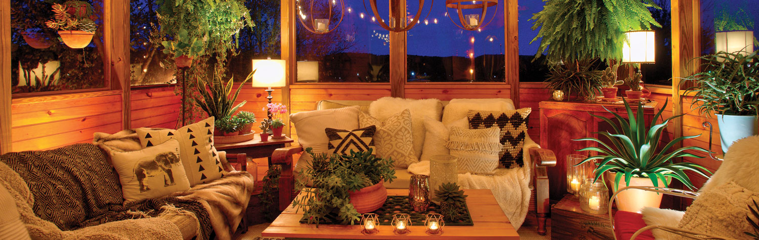 What was originally a deck was transformed into a three-seasons room by Ron. The comfy and welcoming space is furnished with Stacey’s repurposed finds and accessorized with plants, interesting objects and her favorite throw pillows.