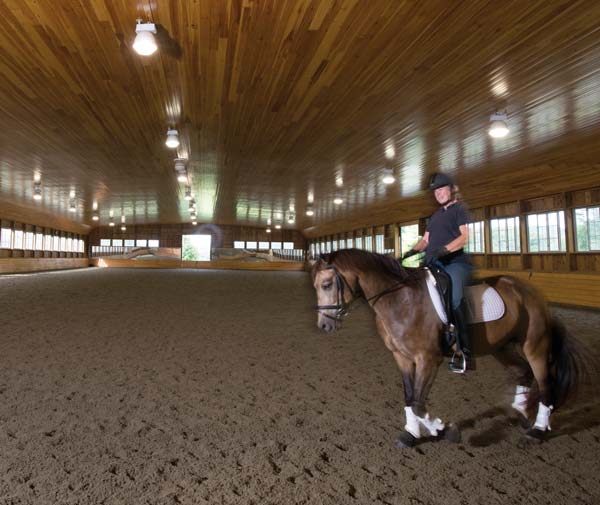 The barn includes a large arena; here Pam and Grady practice for dressage.
