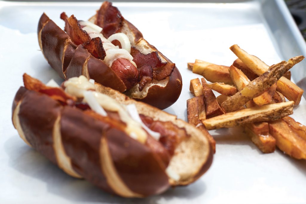 Cheddar cheese pretzel dogs … Kunzler bacon and Beef Franks, diced onion, melted Honey Brook Smoked Cheddar from September Farm on a warm pretzel bun. They’re served with a side of homemade Yukon Gold potatoes fried in peanut oil and a sprinkling of Maldon salt.