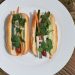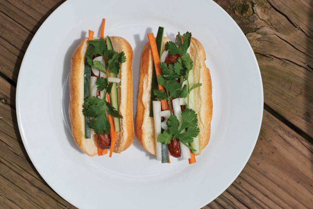 A Vietnamese banh mi-style hot dog is comprised of deliciously crunchy carrots, cilantro, onion, cucumber and Chinese radish.