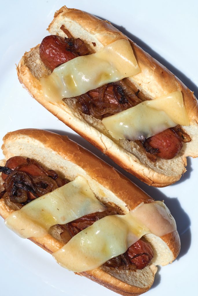 I turned to soups and sandwiches as inspiration for upgrading my hot dog experience. Caramelized onions are paired with melted, imported Swiss gruyère cheese and placed atop a toasted French brioche roll to create a French onion-inspired hot dog.