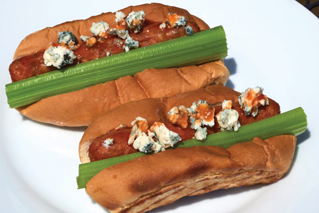 Chicken … bleu cheese, celery, Crystal Hot Sauce and Wegman’s Organic Uncured Chicken Hot Dogs on a toasted split-top bun.