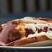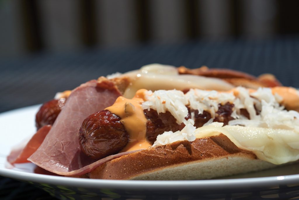 Reuben inspired … aged Swiss cheese, Dietz & Watson corned beef (California style), sauerkraut, Russian dressing and Hebrew National Jumbo Beef Franks on toasted rye bread.