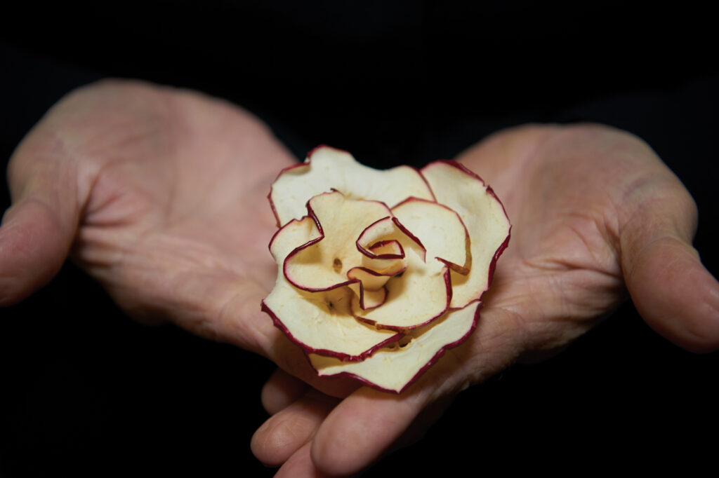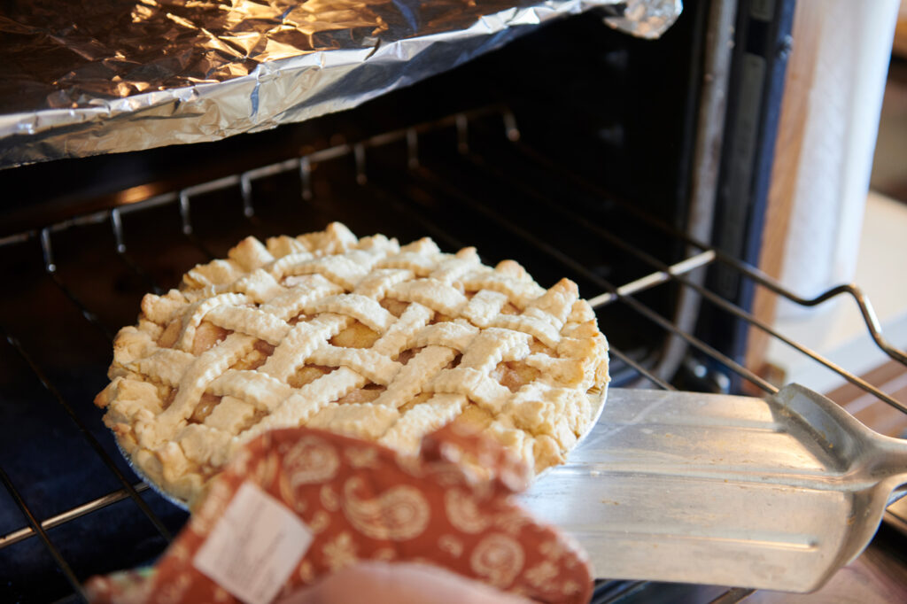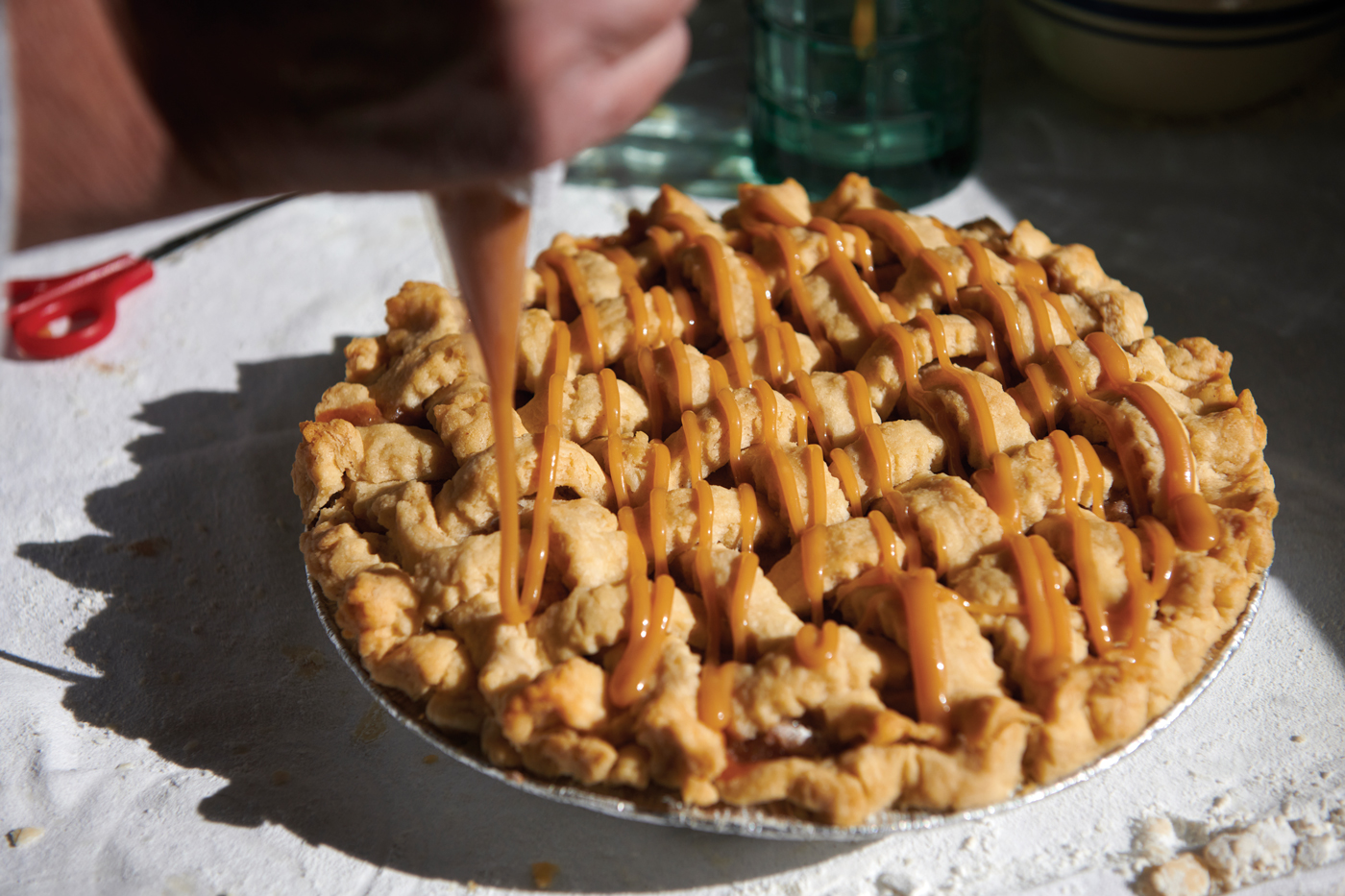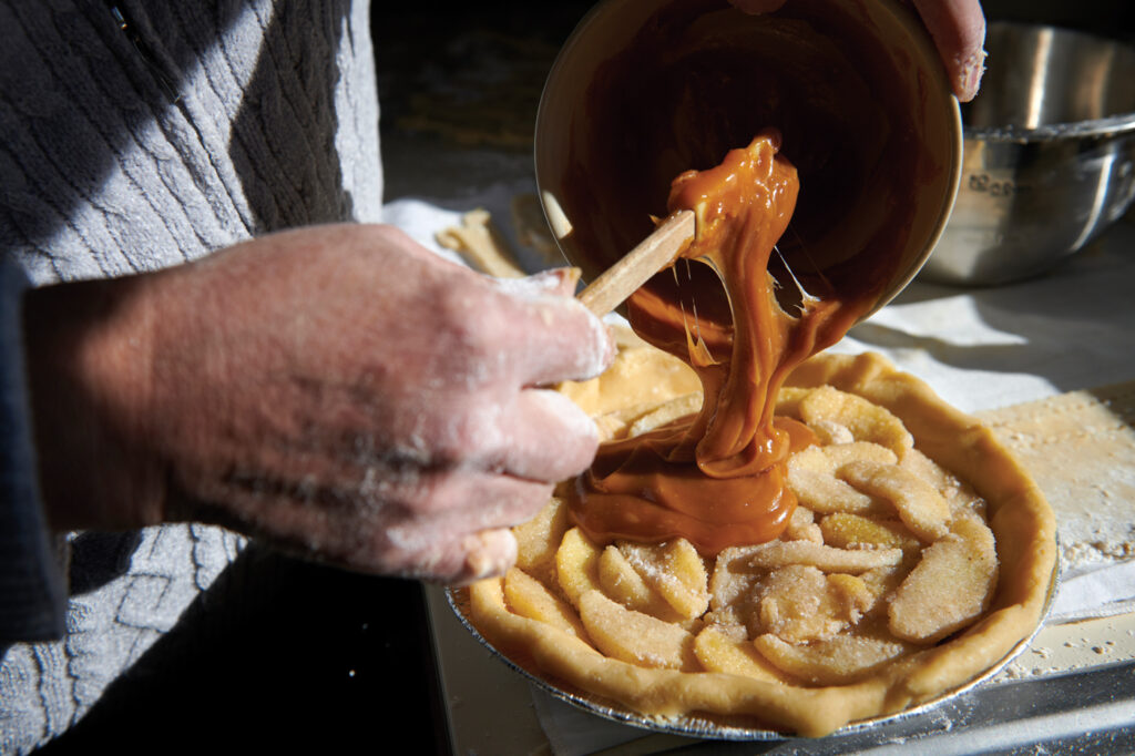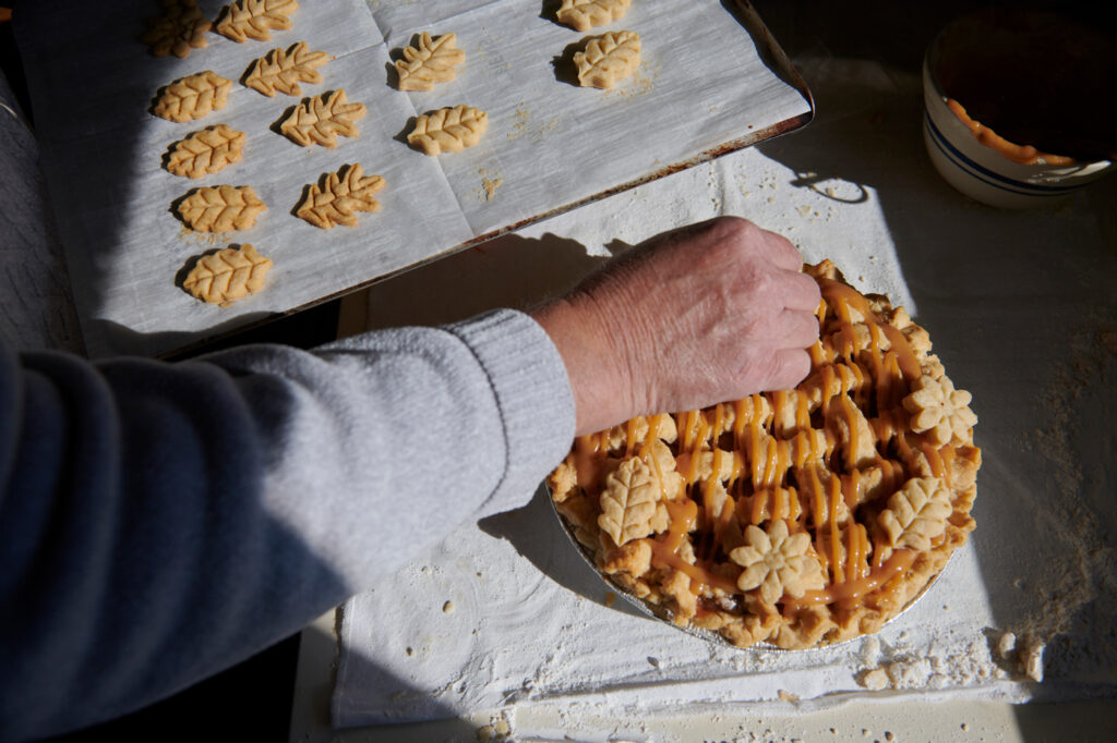 Pie dough baked in the form of leaves and flowers will decorate the top of this year’s caramel apple pie recipe.