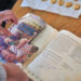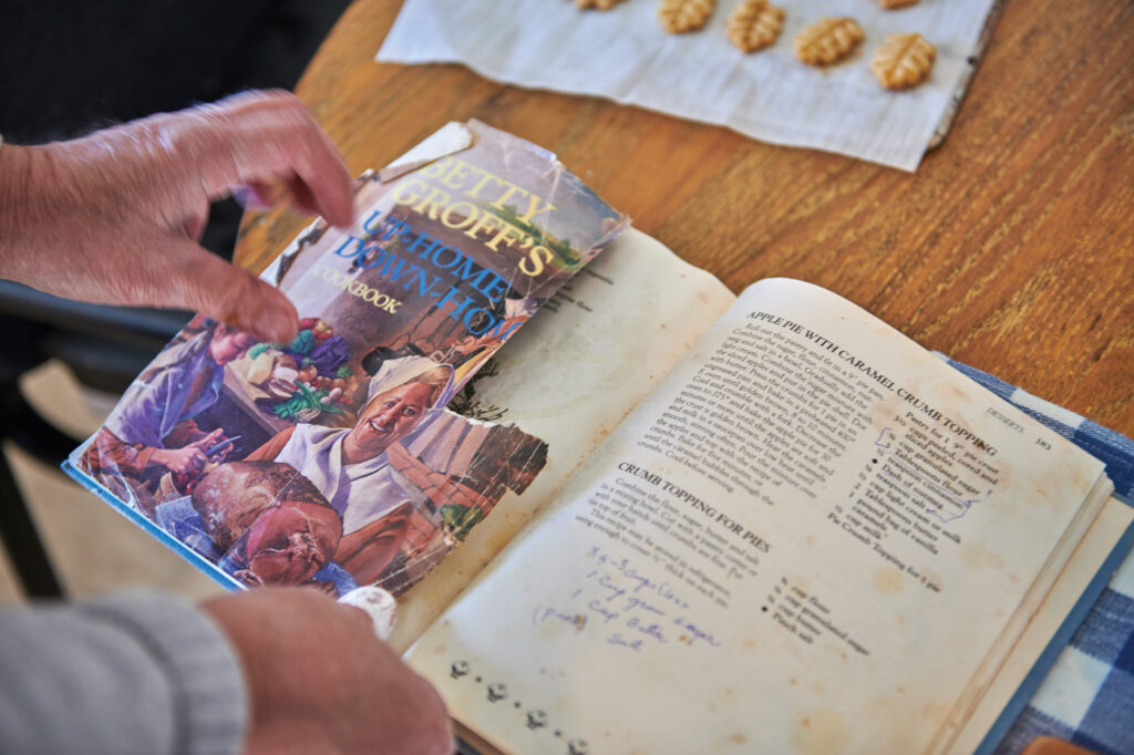 Deb consults Betty Groff’s recipe, “Apple Pie With Caramel Crumb Topping” from Up Home Down Home Cookbook, to create the crumble for her pie.