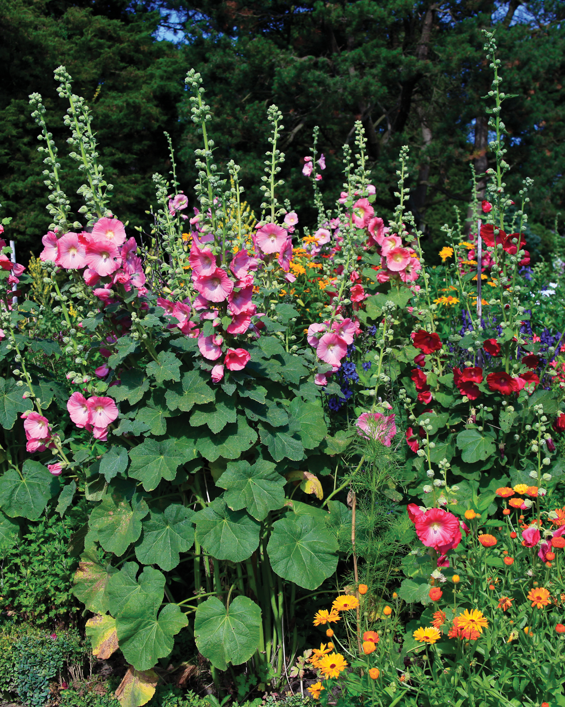Hollyhock (Alcea): Biennial. Because of their height, they’re great for the back row of your border. Self-seeds.
