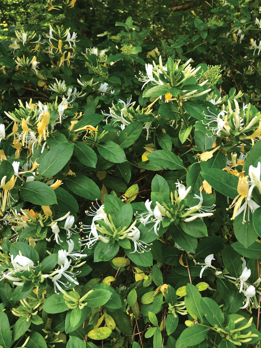 Honeysuckle (Lonicera): Blooms May to June. Full sun. Fall berries are attractive to birds. Can be invasive.
