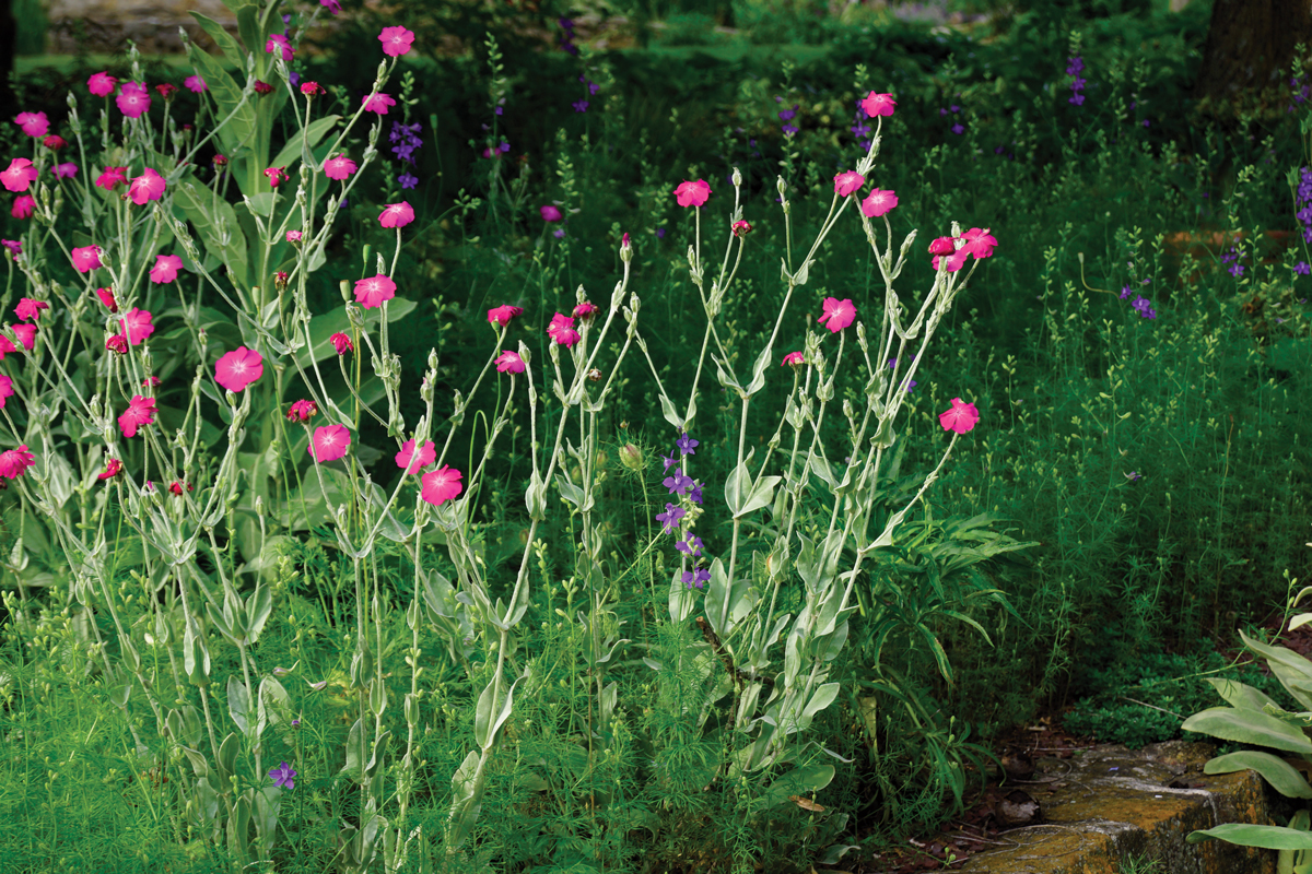 Rose Campion (Lychnis): Vivid magenta flowers with wooly silver foliage. Blooms May into July in full sun. Easy to grow and will freely self-seed.