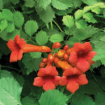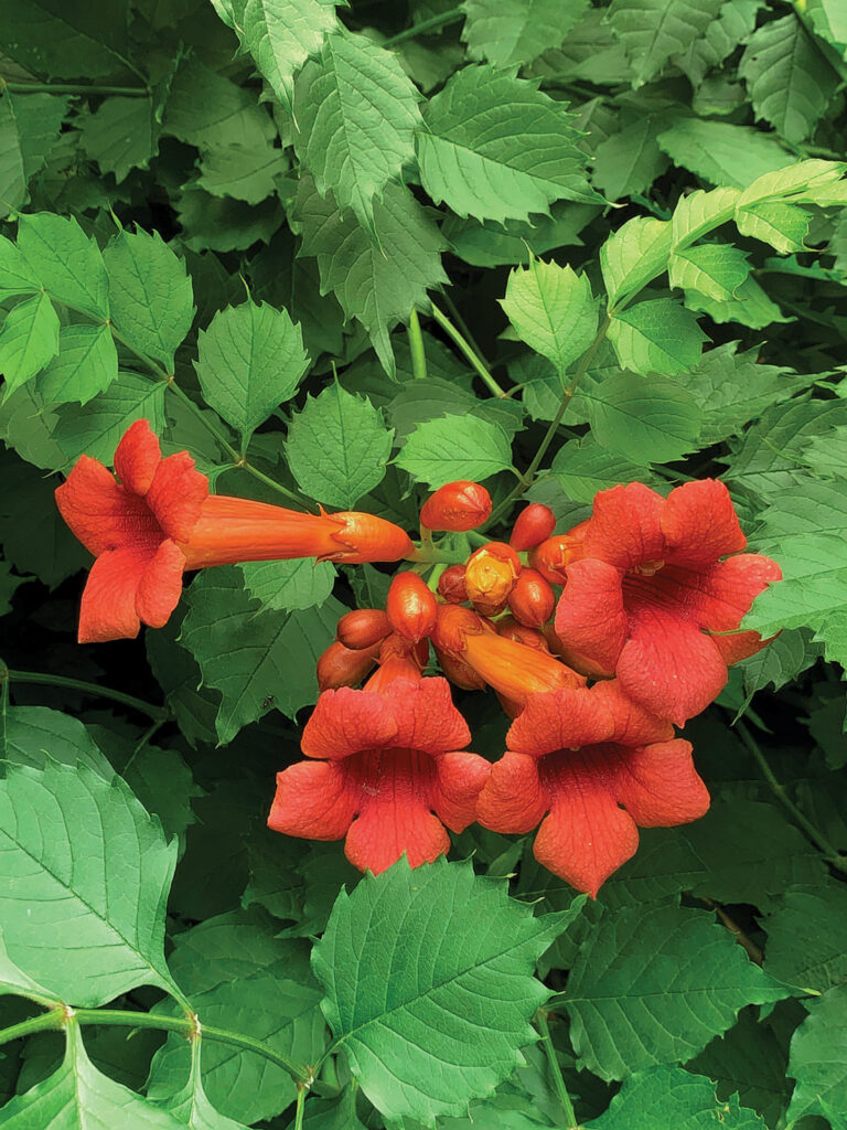 Trumpet Vine (Campsis, Bignonia): Vines can grow up sturdy trellises or along fences, making feeding easy for the birds. Blooms mid-summer. Can be very aggressive.