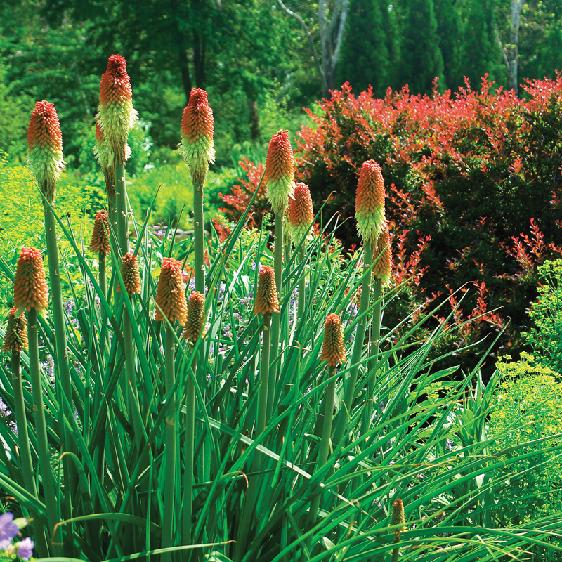 Red Hot Poker (Kniphofia): Tall plant with dramatic/bold flowers. Early summer bloomer. No boggy soil.