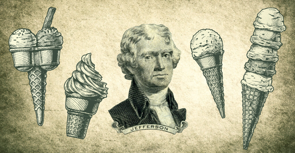 As for George Washington, Smith reports that he was introduced to ice cream by Virginia’s colonial governor. He soon began buying accoutrements such as molds, an ice cream “machine” and serving pieces, including 36 ice pots that held small servings of the treat that exhibited a more liquid-like consistency than modern-day ice cream. Washington so loved ice cream that records at Mount Vernon show that one summer he spent $200 on his hobby, which equates to more than $6,000 in today’s economy. He and his wife, Martha, loved to experiment with adding flavor to ice cream and often utilized the fruit that grew in Mount Vernon’s orchards and gardens.