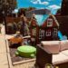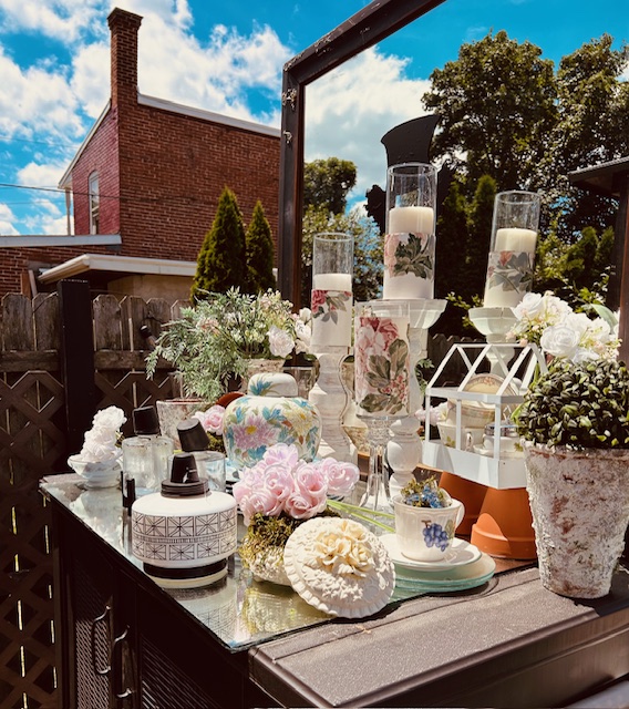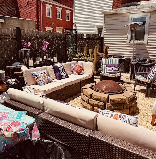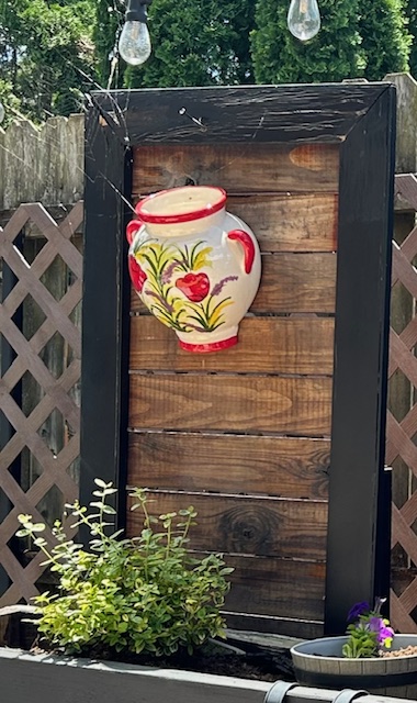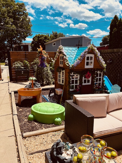 The family moved here from Bridgeport, Connecticut (by way of Brooklyn) several years ago and immediately began to transform the backyard of their home. Dan designed and built fencing and other features. Becky went to work planting flowers and vegetables and adding personality to the space through finds such as old window frames, lighting fixtures, furnishings and vintage accessories. Fire pits add to the comfort factor once cooler weather arrives. “We have Christmas parties out here,” Elena reports.
