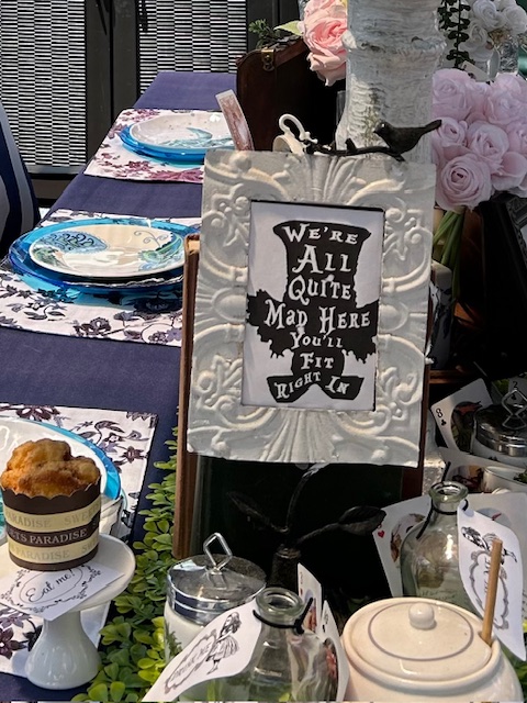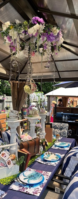 Becky also infuses her backyard with personality by choosing a theme that changes according to the season, the holiday or simply her whim. This summer, the theme is Mad Hatter’s Tea Party, which starts on the front porch with a mannequin dressed in a ballgown (plus other decorations) and makes its way through the backyard. Becky says the garden and themes somehow pay homage to her mother. “You will find her memory in many places in my garden, from her favorite roses to her love of fairies,” Becky noted in the program for the recent Art in the Garden Tour that benefited Create Columbia.