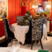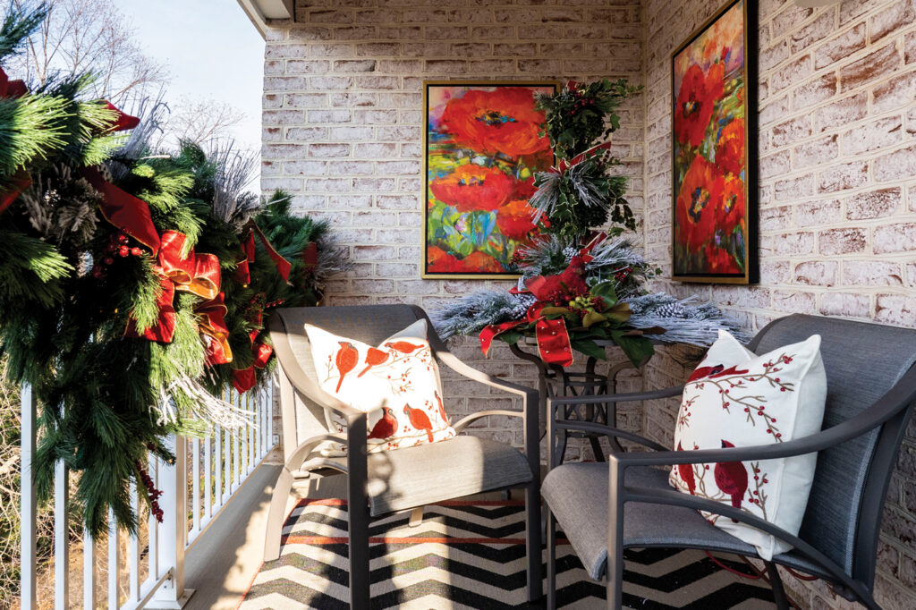 Carolyn’s balcony is also decorated for the holidays with evergreen swags, a tabletop tree, seasonal throw pillows and colorful paintings from the artist, Christiane David.