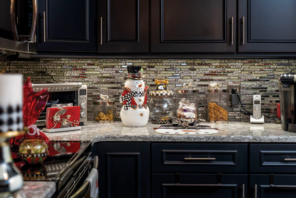 In Carolyn’s case, she was ready to start over to a large degree but didn’t want to part with treasures such as her collection of MacKenzie-Childs enamelware – specifically black-and-white patterned Courtly Check pieces – decorative items from Michael Aram and Jack’s collection of model cars that he had built and painted.