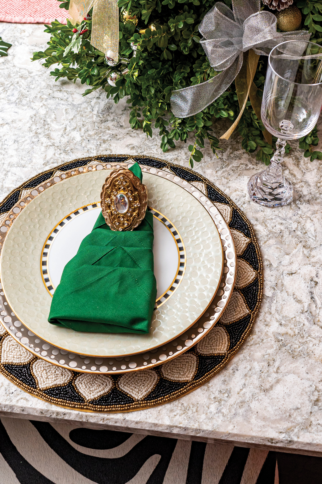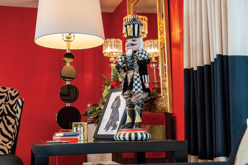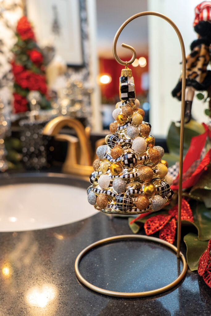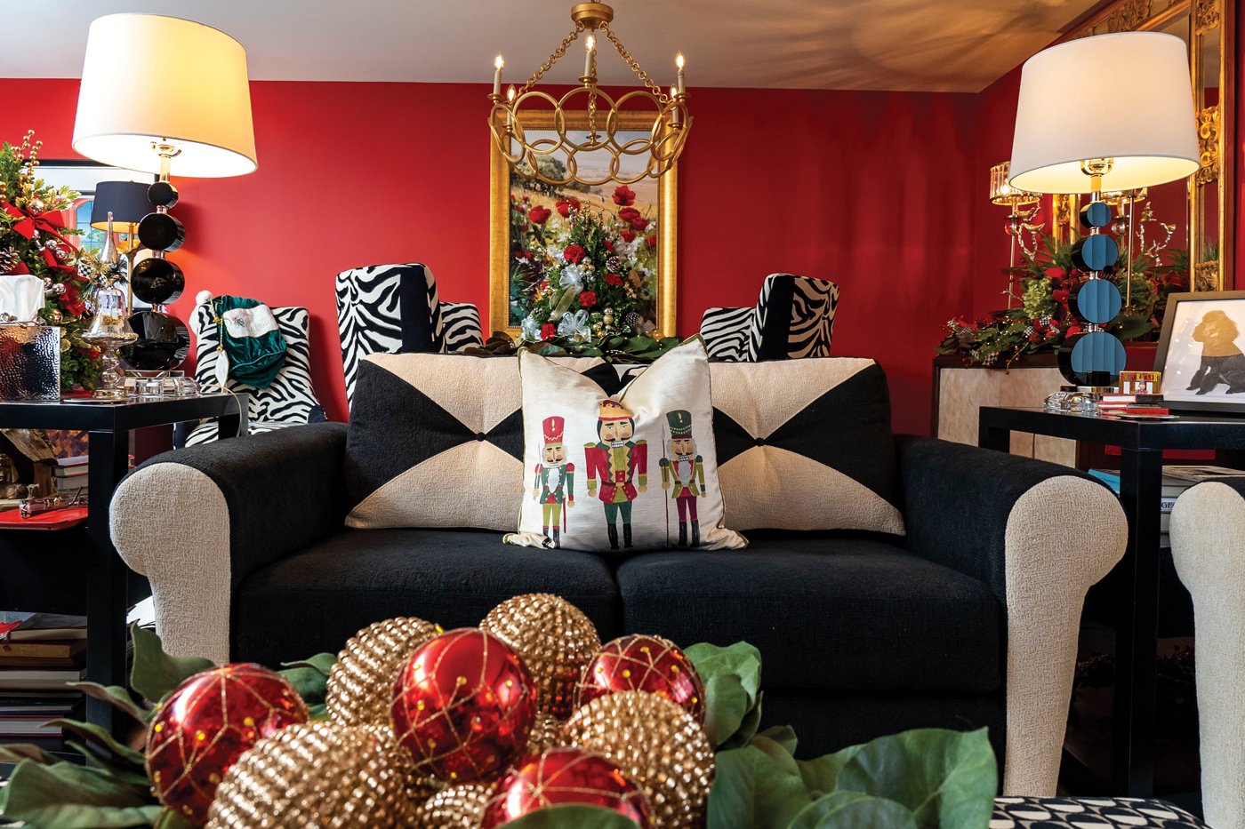 The loveseats enabled Carolyn to repeat the black-and-white color scheme she so loves. For holiday decorating, she embellishes the color scheme with red and silver accents and relies on tabletop trees and items she has collected over the years to bring a festive air to her home.