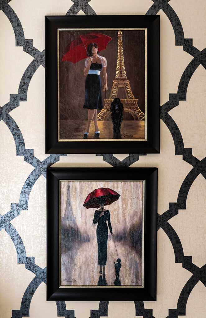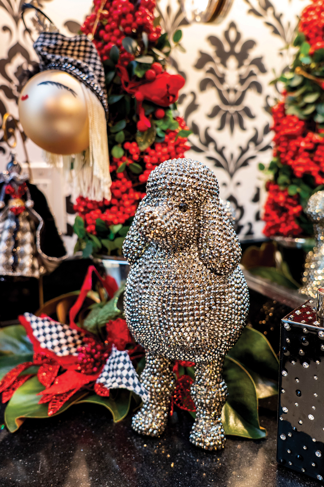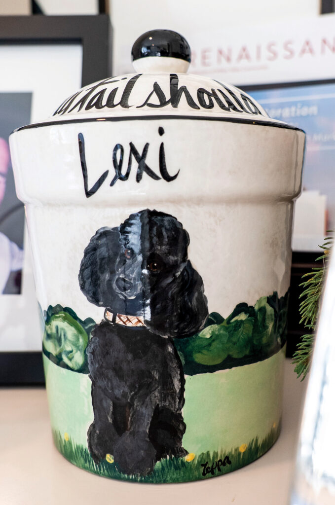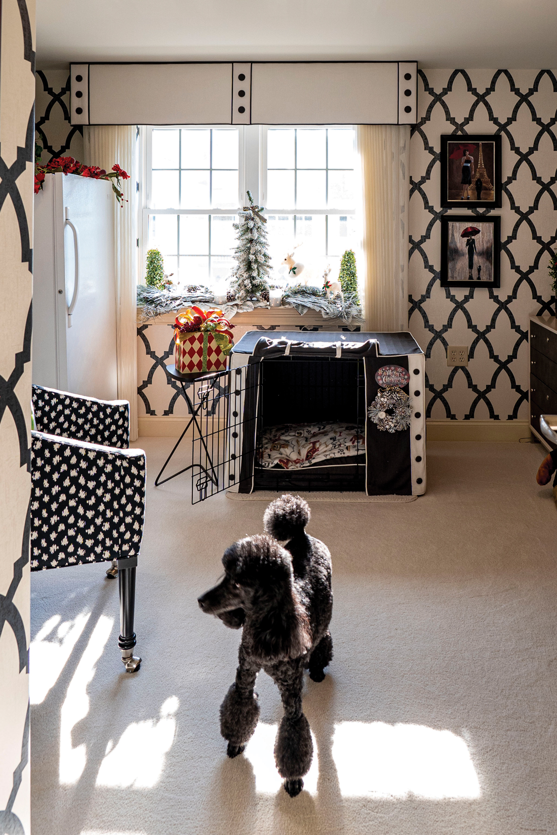 Lexi’s room, which continues the black-and-white color scheme, is outfitted with a custom crate and baskets filled with toys. Poodle-inspired art hangs on the walls. Carolyn adores Lexi and credits her for helping her weather the pandemic. “We’d go for walks a couple times a day and sometimes we’d just get in the car and go for long rides,” Carolyn says. “It was nice to have her to talk to and keep me company.”
