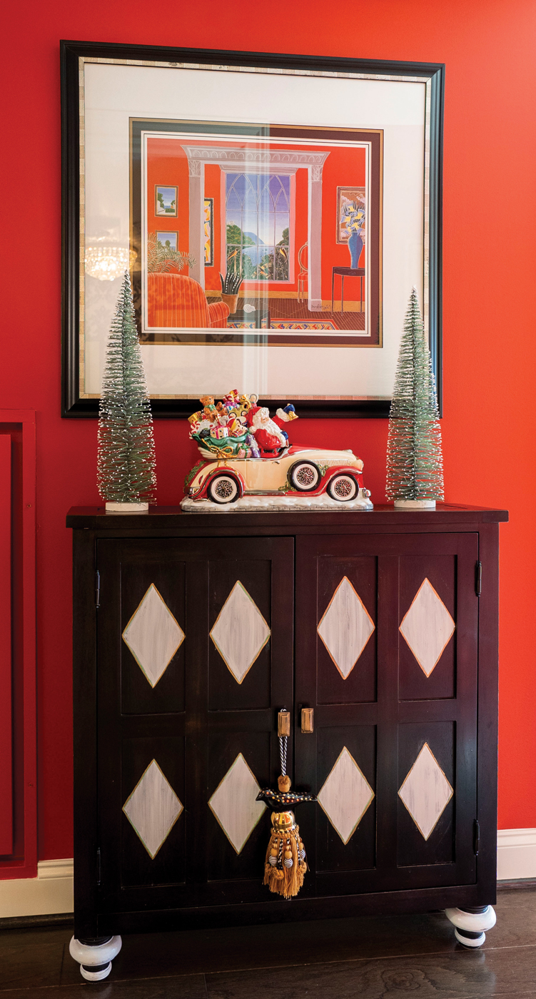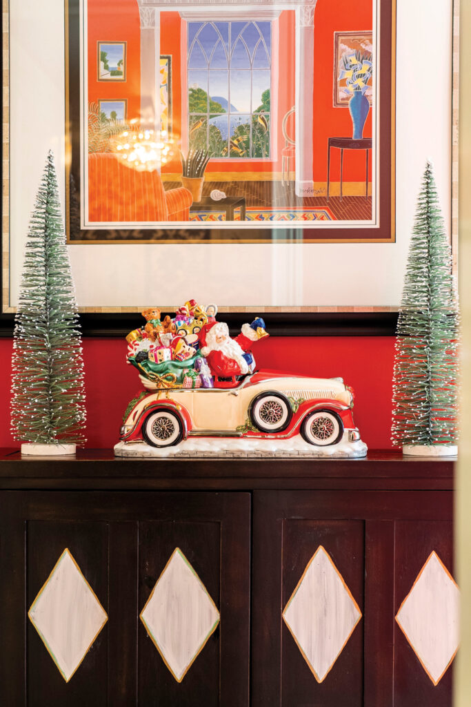 A cabinet painted by Donna Hughes is topped with bottlebrush trees and a cookie jar from the Christopher Radko Gallery at the former Doneckers store.