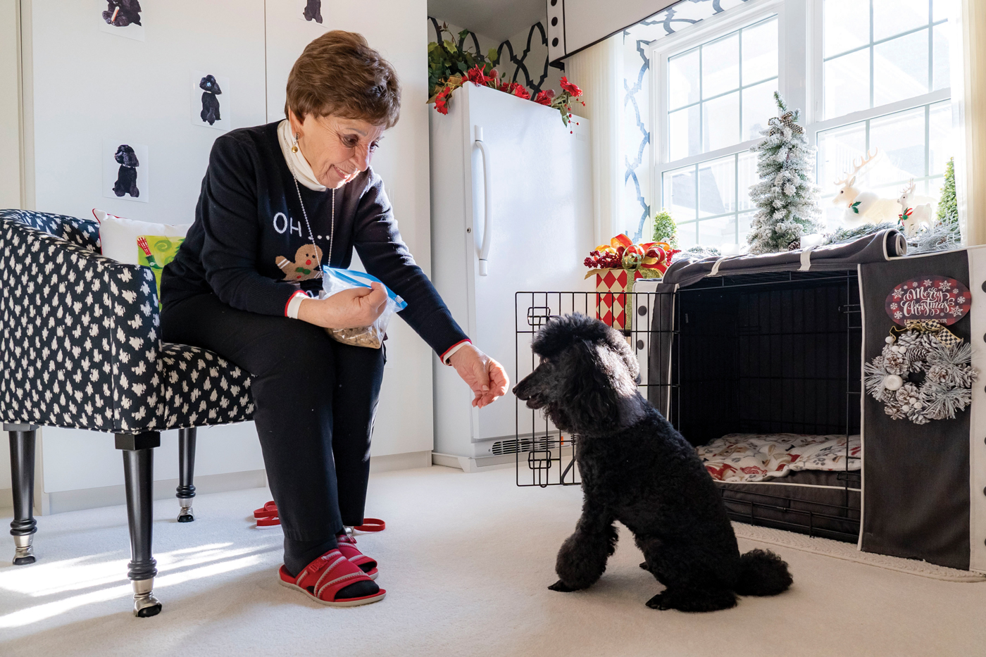 She began her search at the source and contacted the American Kennel Club for help and was directed to Joy Nachmias, a breeder of merit who owns and operates Murrmaid Poodles in Conestoga. (Two Murrmaid poodles won awards at Westminster in 2016 and 2017.) Carolyn wanted to adopt an older dog, but fell in love with 6-month-old Lexi, whose birthday is on New Year’s Day. Lexi went through obedience training at Kaye Ames and returns to Joy’s care at Joy’s Salty Dog Salon for grooming and pawdicures. “The residents here just love to see what color Lexi’s nails are after a trip to Joy’s,” Carolyn says.
