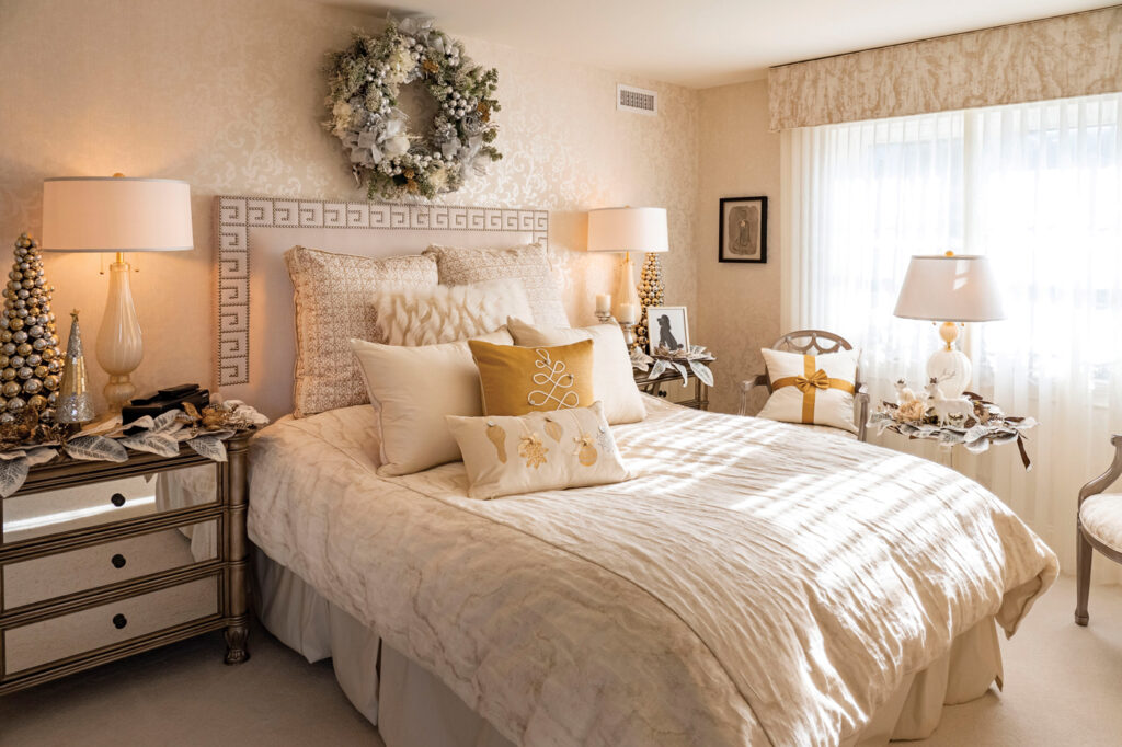 Taking a cue from the main bedroom in her townhouse, Carolyn chose to take a more serene route and furnish and decorate her bedroom at Willow Valley with traditional pieces, as well as employ a champagne-hued color scheme.