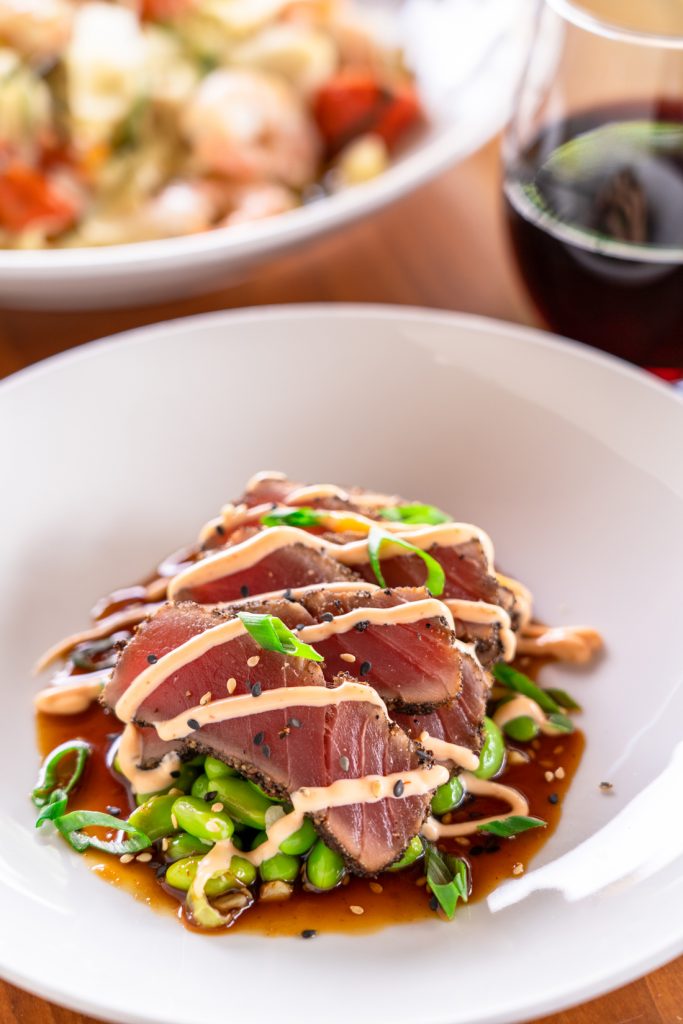 Pictured front to back are Tuna Tataki (tuna, garlic edamame, sesame soy sauce and spicy mayo), Rampi Scampi and Jamaican Jerk Pork Chop, as well as pairings of wine and beer.
