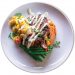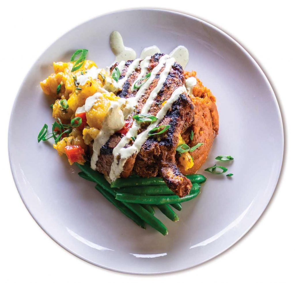Jamaican Jerk Pork Chop: local pork, pineapple-mango relish, cilantro crema and mashed sweet potatoes.