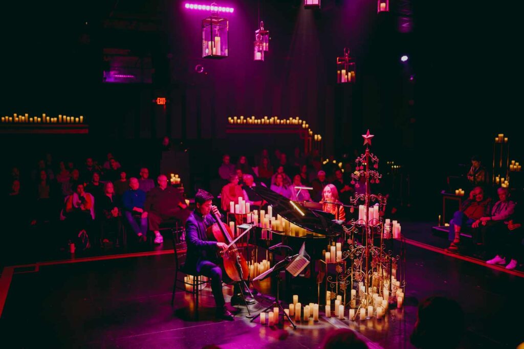 Groff who is becoming known for his versatility (the Disney film, Frozen; King George in the smash Broadway hit, Hamilton; his turn as a cosmetic surgeon on HBO’s And Just Like That and as an FBI agent in Netflix’s Mindhunter), attended the show with longtime friend, Cody Smith, who is the director of Illumination. The show, now in its third year, blends traditional holiday carols with modern favorites and is presented in a candlelit setting in which four vocalists are accompanied by a live ensemble of musicians playing the piano, cello, guitar and percussion instruments.