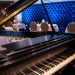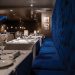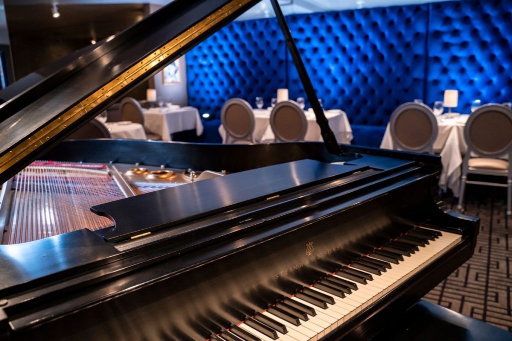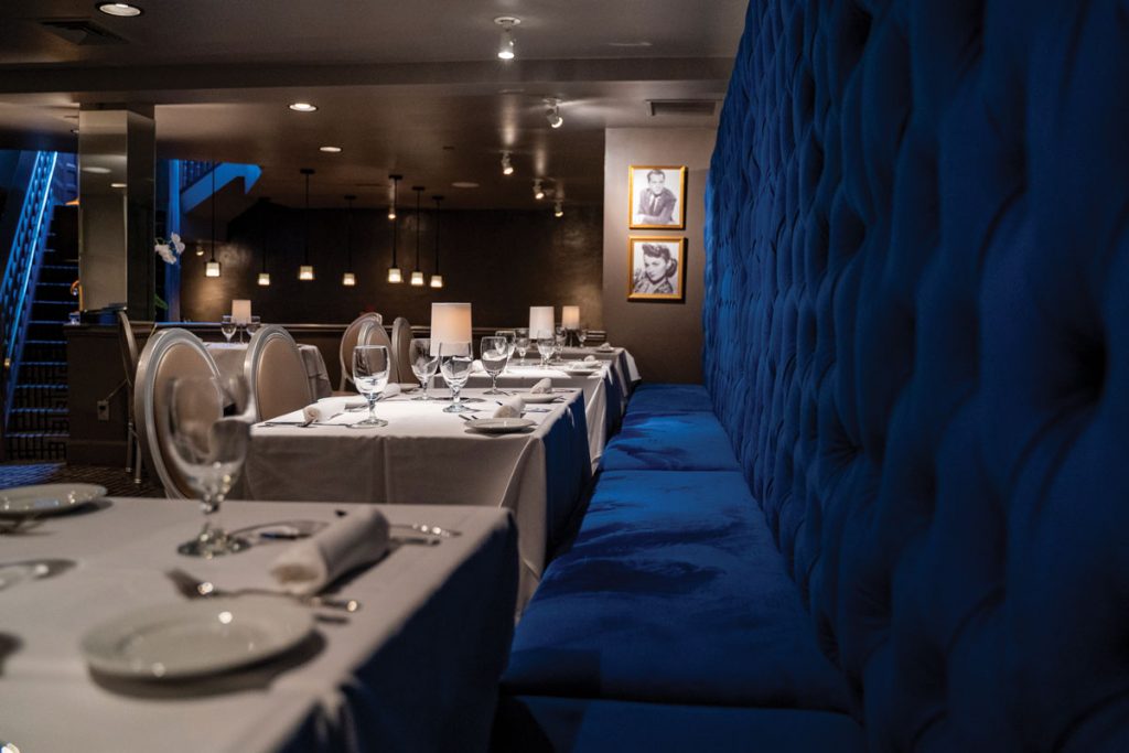 A bar area is tucked under the staircase. In addition to bar seating, a few tables are placed in front of a mirrored wall. A grand piano graces the adjoining dining area, which features tables and a floor-to-ceiling blue-velvet banquette.