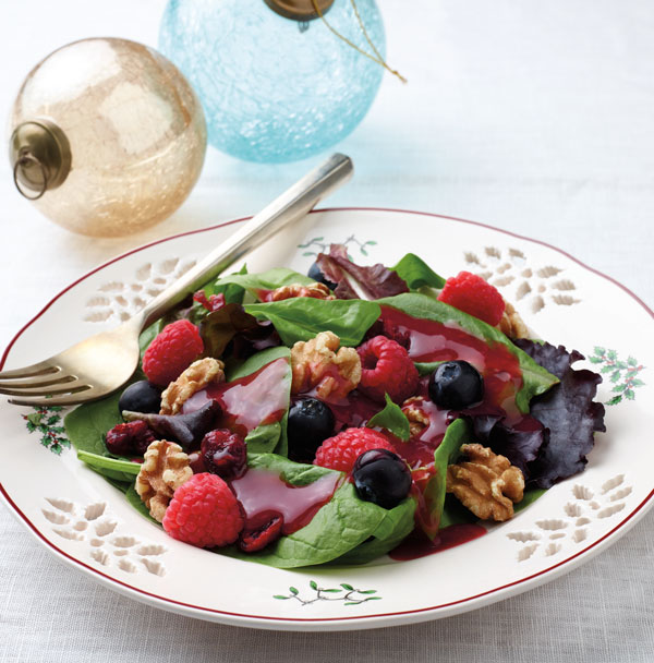 Heart disease has always been a part of my life. My father had a heart condition, and my husband was born with a heart defect that affected his bicuspid aortic valve. As a result, I’ve become more aware of what I serve for parties and family gatherings and always include a few things that are heart healthy. This salad is a case in point. Guests always love it (it doesn’t matter whether they are watching their weight or sodium levels or not). The addition of berries provides natural sweetness, while the nuts deliver crunch. The swirl of colors is eye-catching, especially for holiday gatherings. Best of all, it’s simple to make, which is good for my heart! As for the dressing, take the easy route. We’ve found some tasty vinaigrettes at Panera Bread (low-sodium raspberry), Stauffers and Giant (Marzetti’s Simply Dressed Pomegranate).